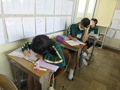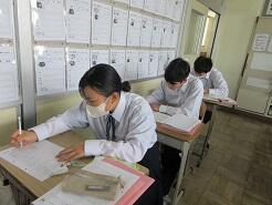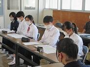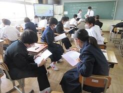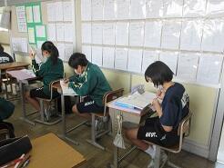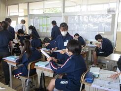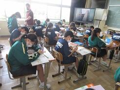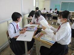 外国の学校について、感想や意見を伝え合う活動のための準備をしていました。