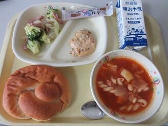今日の給食は、米粉パン、キャラメルクリーム、牛乳、鶏肉のレモンペッパー焼き、サラミソーセージとブロッコリーのサラダ、ミネストローネです。大豆、キャベツ、玉ねぎ、大根、米粉パンです。今日もたいへんおいしく頂きました。