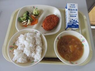 今日の給食は、麦ご飯、牛乳、コロッケ、ブロッコリーとしめじのサラダ、なめこ汁です。高根沢町で生産されたものは、豆腐、味噌、ねぎ、なめこ、米です。今日もたいへんおいしく頂きました。