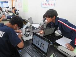 生物の細胞で、自分のほおの内側の細胞を採って観察していました。