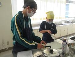 1年2、4組が、調理実習で豚汁づくりを行いました。コロナのため小学校の調理実習が十分できなかったので、どのグループも苦労しているようでした。最後に少しだけ味見させてもらいましたが、とてもおいしかったです。