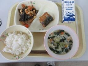 今日の給食は、ご飯、牛乳、さば味噌煮、五目煮豆、ゆばとほうれん草のスープです。高根沢町で生産されたものは、大豆、にんじん、ねぎ、米です。今日もたいへんおいしく頂きました。