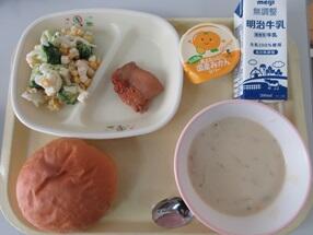 今日の給食は、北高根沢中1年1組の献立で、セルフ照焼きチキンバーガー(丸型牛乳パン・照焼きチキン)、牛乳、コーンとブロッコリーのサラダ、クラムチャウダー、みかんゼリーです。高根沢町で生産されたものは、にんじん、玉ねぎです。今日もたいへんおいしく頂きました。