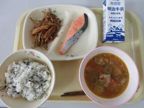 今日の給食は、わかめご飯、牛乳、鮭塩焼き、五目きんぴら、豚汁です。高根沢町で生産されたものは、味噌、ねぎ、にんじん、米です。今日もたいへんおいしく頂きました。