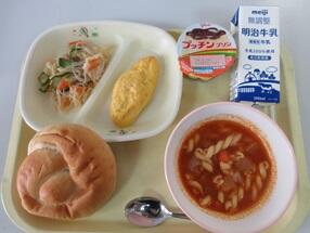 今日の給食は、米粉パン、牛乳、オムレツ、春雨サラダ、ミネストローネ、プリンです。高根沢町で生産されたものは、大豆、にんじん、玉ねぎ、米粉パンです。今日もたいへんおいしく頂きました。