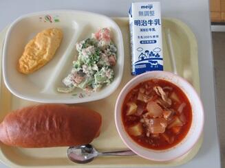 今日の給食は、いちごパン、牛乳、オムレツ、野菜ツナマヨ和え、ポークビーンズです。高根沢町で生産されたものは、にんじん、トマト、いちご、玉ねぎです。今日もたいへんおいしく頂きました。