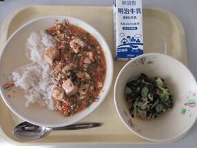 今日の給食、マーボー丼(麦ご飯・マーボー丼の具)、牛乳、チョレギサラダです。高根沢町で生産されたものは、味噌、にんじん、ねぎ、米です。今日もたいへんおいしく頂きました。
