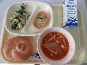 今日の給食は、米粉パン、牛乳、野菜グラタン、イタリアンサラダ、ミネストローネです。高根沢町で生産されたものは、大豆、にんじん、玉ねぎです。今日もたいへんおいしく頂きました。