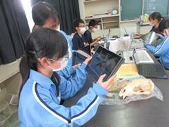 動物の頭蓋骨の標本を使って、肉食動物と草食動物の目や歯の特徴をまとめていました。