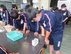 水溶液が電気を通すか、通さないかを確かめる実験に取り組んでいました。