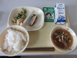 今日の給食は、ご飯、牛乳、さんまかぼすレモン煮、干ぴょうのごま酢和え、沢煮椀、ふりかけです。高根沢町で生産されたものは、きゅうり、しいたけ、大根、キャベツ、米です。今日もたいへんおいしく頂きました。