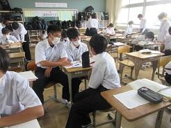 校歌の歌唱のテストを練習室でやっていたので入れませんでした。テストを受けている生徒以外はワークに取り組んでいました。