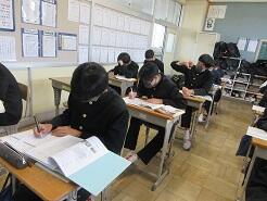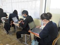 タブレットを使い、短歌の鑑賞文を書いていました。終わった生徒は、校外学習で短歌を作っていました。