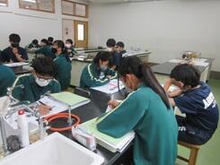 塩化銅水溶液の、電気分解の実験に取り組んでいました。
