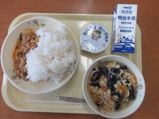 今日の給食は、プルコギ風豚丼(ご飯、プルコギ風豚丼の具)、牛乳、きくらげと卵のスープ、ヨーグルトです。高根沢町で生産されたものは、豆腐、にんじん、キャベツ、きくらげ、ねぎ、玉ねぎ、米です。今日もたいへんおいしく頂きました。(3年4組に行って、生徒の給食を撮影してきました。)