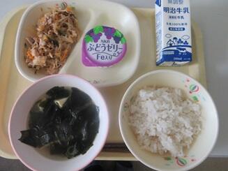 今日の給食は、セルフ豚キムチ丼(麦ご飯、豚キムチ丼の具)、牛乳、わかめスープ、ぶどうゼリーです。高根沢町で生産されたものは、豆腐、玉ねぎ、米です。今日もたいへんおいしく頂きました。