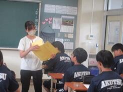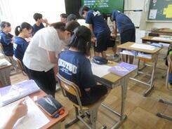 今日の1年5組の、栄養教諭とのTT授業を見ているとき、1番後ろに座っている女子生徒の消しゴムが落ちたので拾って渡しました。すると「ありがとうございます。」という言葉が返ってきました。とても気持ちがよかったです。当たり前のことを当たり前にできる生徒をもっと増やしたいと思いました。