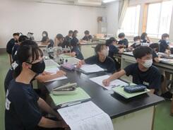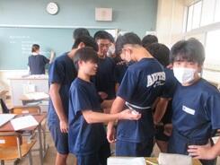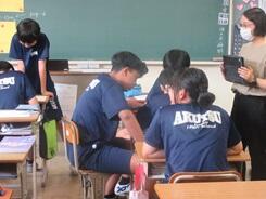 採寸の仕方について学習し、実際に採寸していました。採寸したくない生徒へは、採寸する場所の確認だけでよいという指示が出されていました。