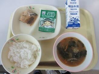 今日の給食は、ご飯、牛乳、さば味噌煮、じゃがいもと小松菜の味噌汁、ふりかけです。高根沢町で生産されたものは、味噌、玉ねぎ、米です。今日もたいへんおいしく頂きました。