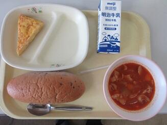 今日の給食は、ブルーベリーパン、牛乳、アンサンブルエッグ、ポークビーンズです。高根沢町で生産されたものは、トマト、ブルーベリー、玉ねぎです。今日もたいへんおいしく頂きました。