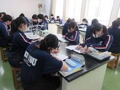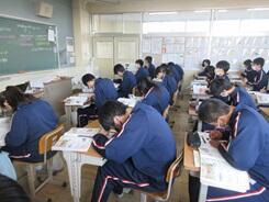 地図記号と縮尺のテストを実施して、その解答を確認していました。