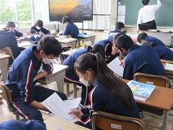 外国の学校について、感想や意見を伝え合う活動のための準備をしていました。