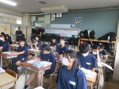 今日の4時間目、3年4組の栄養教諭さんとのTTの授業を見ているときです。栄養教諭さんが資料を使って説明を始めたので、どんな資料かと前にいた男子生徒の資料を後からちょっとのぞき込みました。するとその生徒が「見ますか?」と資料を見せてくれようとしました。何て周りの状況をしっかり把握し、優しくできる生徒なのでしょうか。その一言に、ちょっと嬉しくなりました。