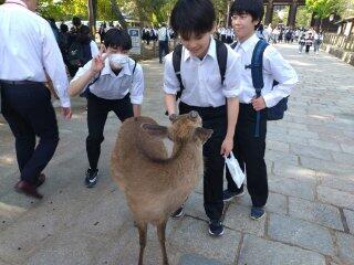 奈良公園に着きました。自由行動で、買い物をしたり、鹿とたわむれたり、みんな楽しそうに過ごしていました。