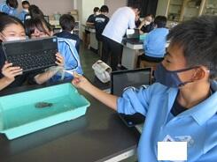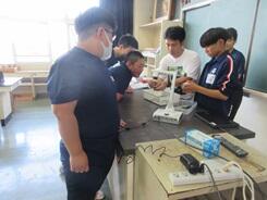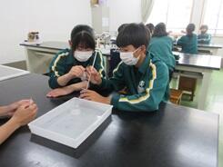 鉄粉、活性炭素、食塩水を使って、発熱反応の実験に取り組んでいました。