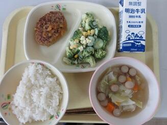 今日の給食は、ご飯、牛乳、ハンバーグおろしソーズ、ブロッコリーとチーズのサラダ、野菜とウインナーのコンソメスープです。高根沢町で生産されたものは、にんじん、玉ねぎ、きゅうり、キャベツ、米です。今日もたいへんおいしく頂きました。