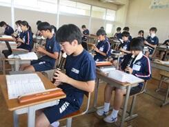 アルトリコーダーで「かっこう」のテストが行われ、終わった生徒は、音楽ワークに取り組んでいました。