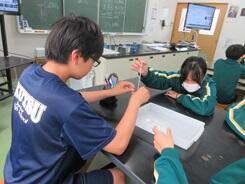 鉄粉、活性炭素、食塩水を使って、発熱反応の実験に取り組んでいました。