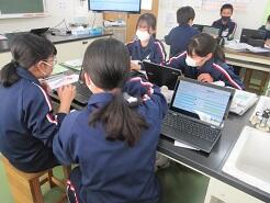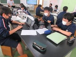 中間テストに向けて、タブレットを使って今まで記録してきたことを基に、授業のふりかえりをしていました。