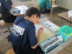 文字から受けるイメージをデザインする作品づくりが進み、ポスターカラーで彩色に入った生徒もいました。