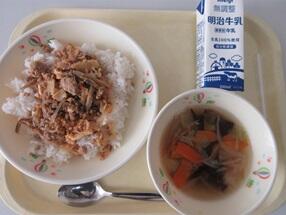 今日の給食は、和風ビビンバ丼(麦ご飯・和風ビビンバ丼の具)、牛乳、きくらげのスープです。高根沢町で生産されたものは、にんじん、きくらげ、玉ねぎ、キャベツ、米です。今日もたいへんおいしく頂きました。