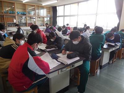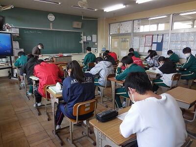 3年生は最後の授業日となりました。明日はいよいよ県立高等学校等の受検となります。教室を覗くと全員が真剣に取り組んでいました。すでに進学先を決定している生徒もいますが、全員が同じ気持ちで学んでいる姿が印象的でした。