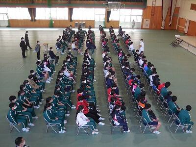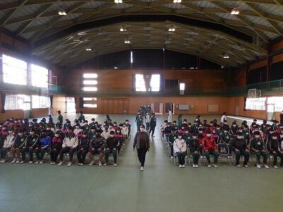 【卒業式予行練習】全校生徒が体育館に集まったのは入学式以来です。全学年とも真剣な態度で練習を行いました。