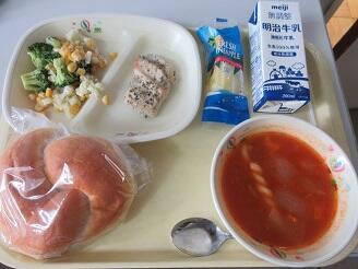 今日の給食は、米粉パン、牛乳、鶏肉のハーブ焼き、コーンサラダ、ミネストローネ、パイナップルです。高根沢町で生産されたものは、大豆、玉ねぎ、米粉パンです。今日もたいへんおいしく頂きました。