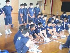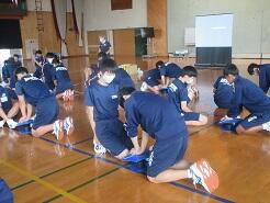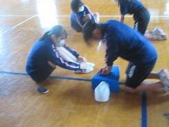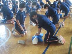 今日、2年生が保健体育の授業で、赤十字救急法を学びました。胸骨圧迫は実際に体験し、AEDの使い方は指導者の見本を見て学習しました。とてもよい経験になりました。