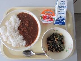 今日の給食は、ご飯、牛乳、ハッシュドポーク、ひじきのサラダ、アセロラゼリーです。高根沢町で生産されたものは、トマト、玉ねぎ、米です。今日もたいへんおいしく頂きました。