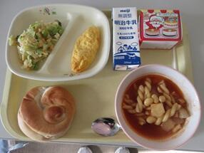 今日の給食は、クリスマスメニューで、米粉パン、牛乳、オムレツ、星のサラダ、ミネストローネ、クリスマスセレクトデザートです。高根沢町で生産されたものは、大豆、にんじん、玉ねぎ、大根です。今日もたいへんおいしく頂きました。