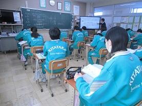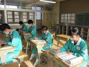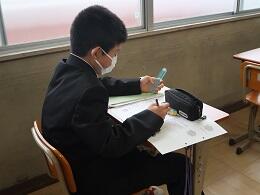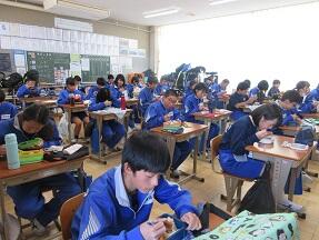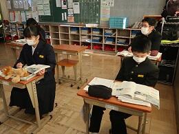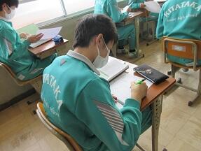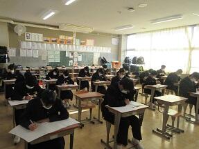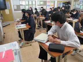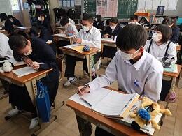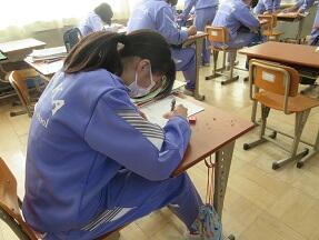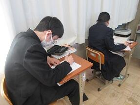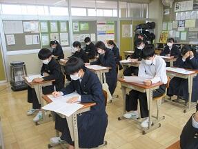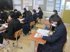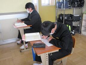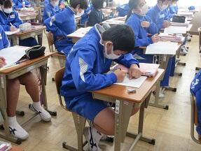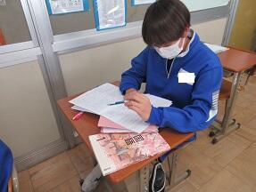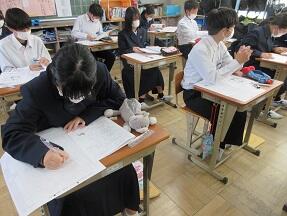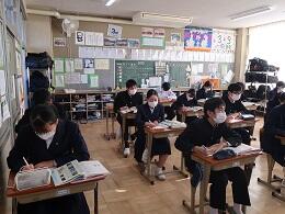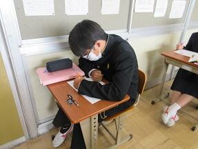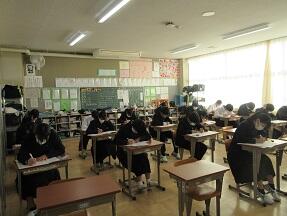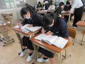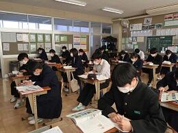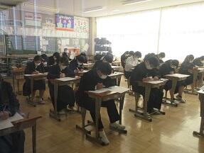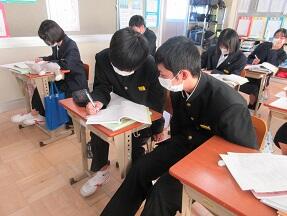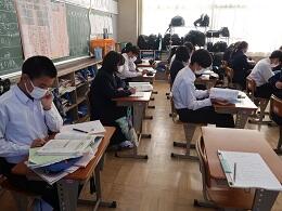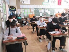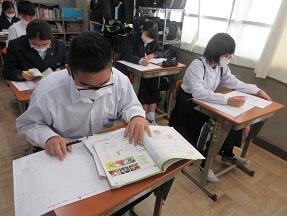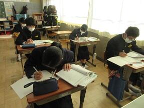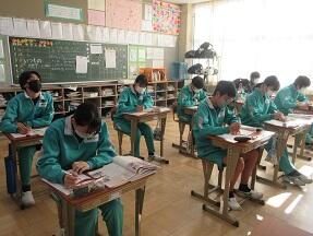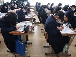 朝、校舎内を見て歩いている教頭先生と養護教諭の先生から、2年1組で男子生徒2名と女子生徒1名が、毎日朝早く来て勉強しているという話があったので、今日見てきました。話のとおり3名ともしっかり勉強していました。素晴らしいです。頑張っている生徒ですから、きっと結果もついてきます。真面目、素直が成長への一番の近道であると思っています。