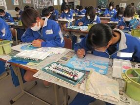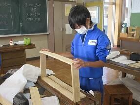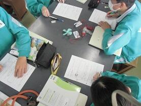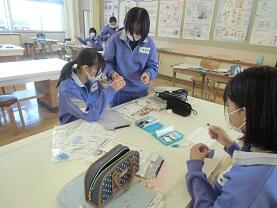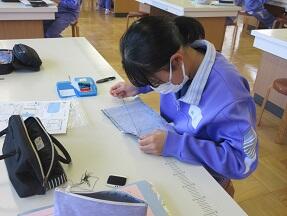 ブックカバーづくりで、しつけ縫いに取り組んでいました。