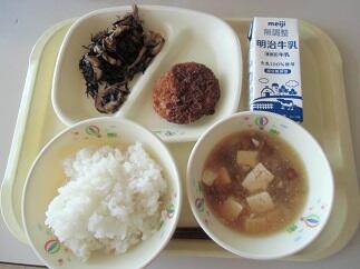 今日の給食は、ご飯、牛乳、ハンバーグ、ステーキソースかけ、のり和え、根菜ごま汁です。高根沢町で生産されたものは、味噌、ねぎ、大根、米です。今日もたいへんおいしく頂きました。