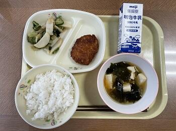 ごはん チキンミンチカツ ごまポテサラダ 豆腐とわかめの味噌汁