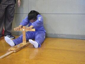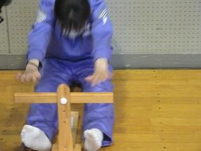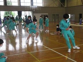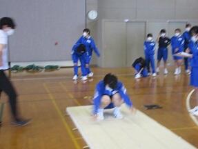 マット運動で、それぞれの課題をグループで協力して解決する活動が展開されていました。