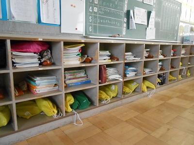教室背面のロッカーの中がきれいに整頓されていました。