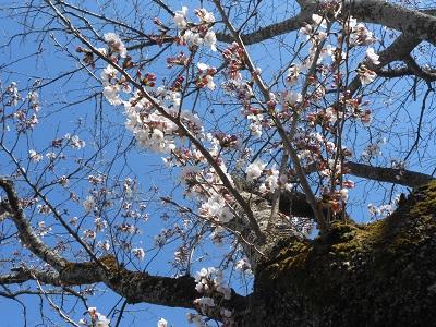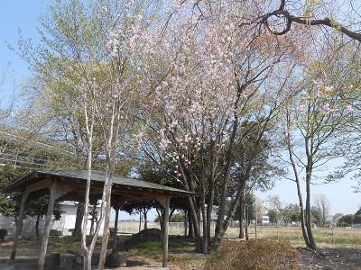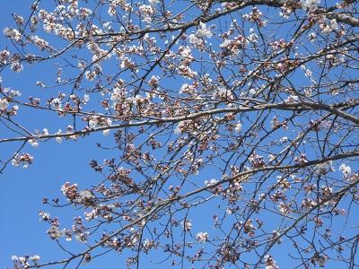 【桜の様子】 校庭南側の桜は全て散ってしまいましたが、テニスコート周辺に2本の桜の木にまだ花が咲いていました。
