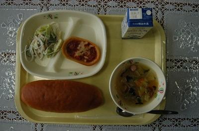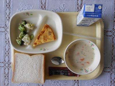 【給食メニュー】 蜂蜜パン、トマトグラタン、シルバーサラダ、野菜とウインナー7のスープです。スープが身体を温めてくれました。