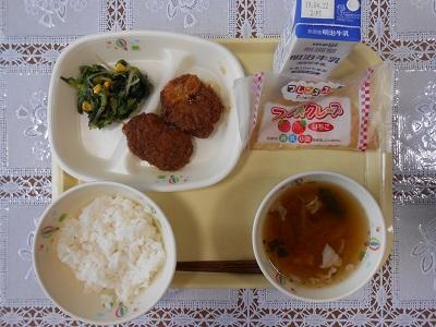 【給食メニュー】 ソースヒレカツ、菜の花和え、沢煮椀、イチゴクレープです。今日は入学・進級祝いのメニューです。